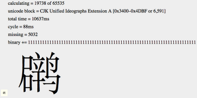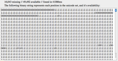 Once the processing has completed you will be presented with a string of binary representing what characters are visible, and which ones are unavailable or invisible (65,535 numbers). Here are the results from my Chromium browser running on OSX 10.6.4: